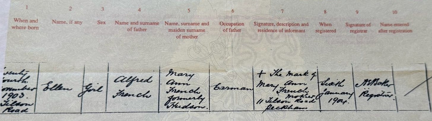In the 1901 census - completed two years before Gran was born - he found her mother. She would still have only been in her late 20’s. She was listed as living at 11 Tilson Road - the address later used on Granny G’s birth certificate - with Grans older brother.