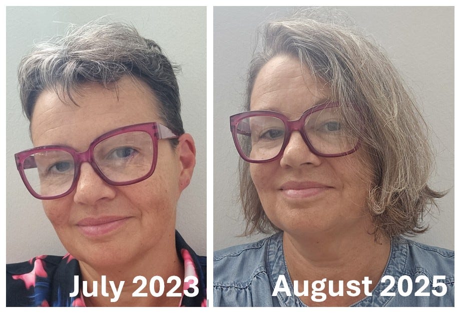 Image caption: two very different versions of my hair. 2023 - just over 6 months out of hospital, gaunt, and still with a haunted look in my eye. My thin hair is not so obvious in the picture, it’s amazing what a colored spray and the right pose can cover up. Fast forward to 2025 - lots more grey, lots more hair (!), and lots more length. And yes it is actually still dark underneath, it’s just covered up by all that grey that grows in a stripe down the top of my head. I must have been a badger in a former life!