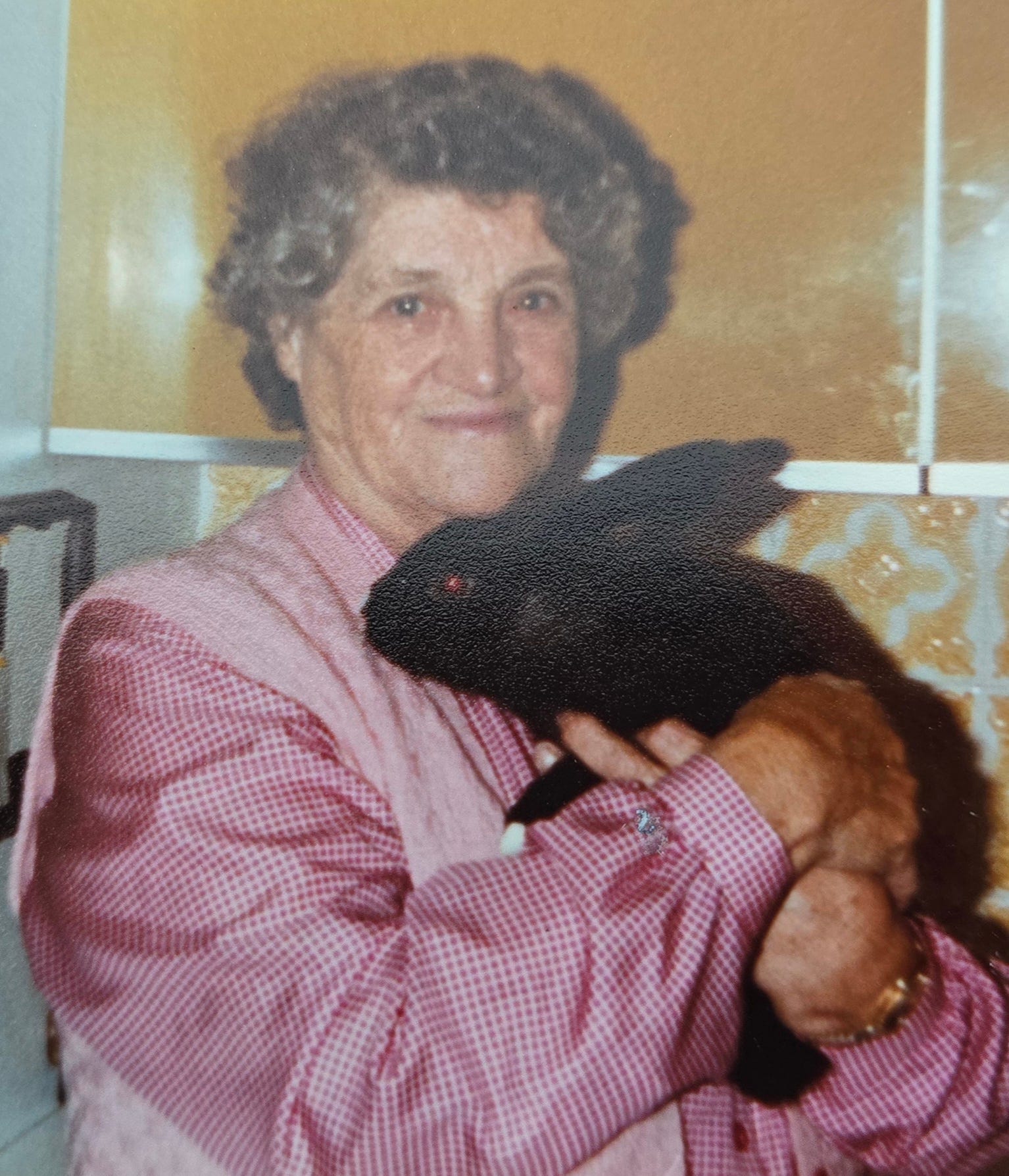 Image caption: Granny G in Mum and Dads kitchen circa 1983 - check out those mustard cupboards and patterned tiles! In this case she’s cuddling my little rabbit Sooty. My other rabbit at the time was white, with silver grey ears and bob tail, what was he called? Silver?! Yes, I tend to be a very literal person.