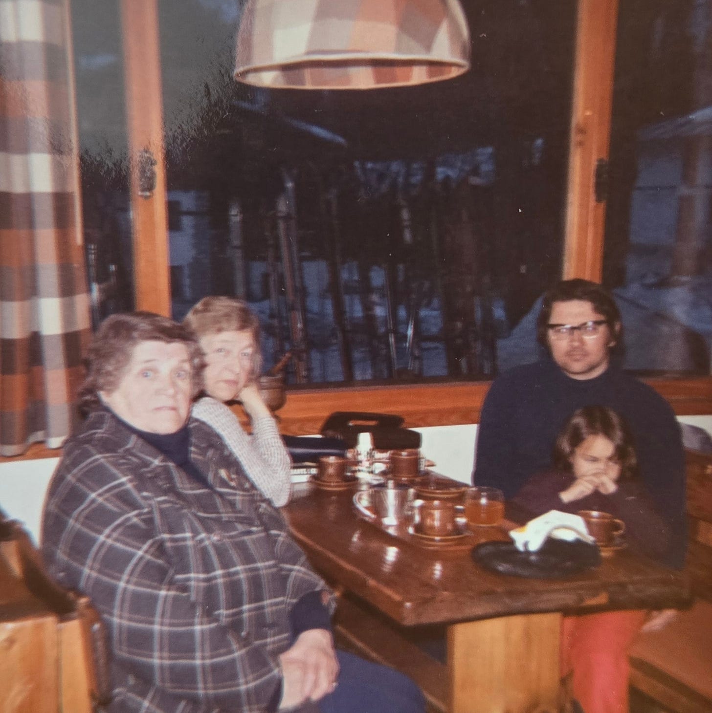 Image caption: I think this was the ski holiday in question where I learned the basic sign alphabet. We took ‘the Grans’ with us a number of times, especially when I was young. In this case it was April 1974 so I had turned 7 years old days before - I just love that look on Granny G’s face! None of us look like we’re having a good time, including me, which is a surprise considering the picture is being taken by Mum with my camera. And what about that matching check lampshade?! The height of 1970’s fashion.