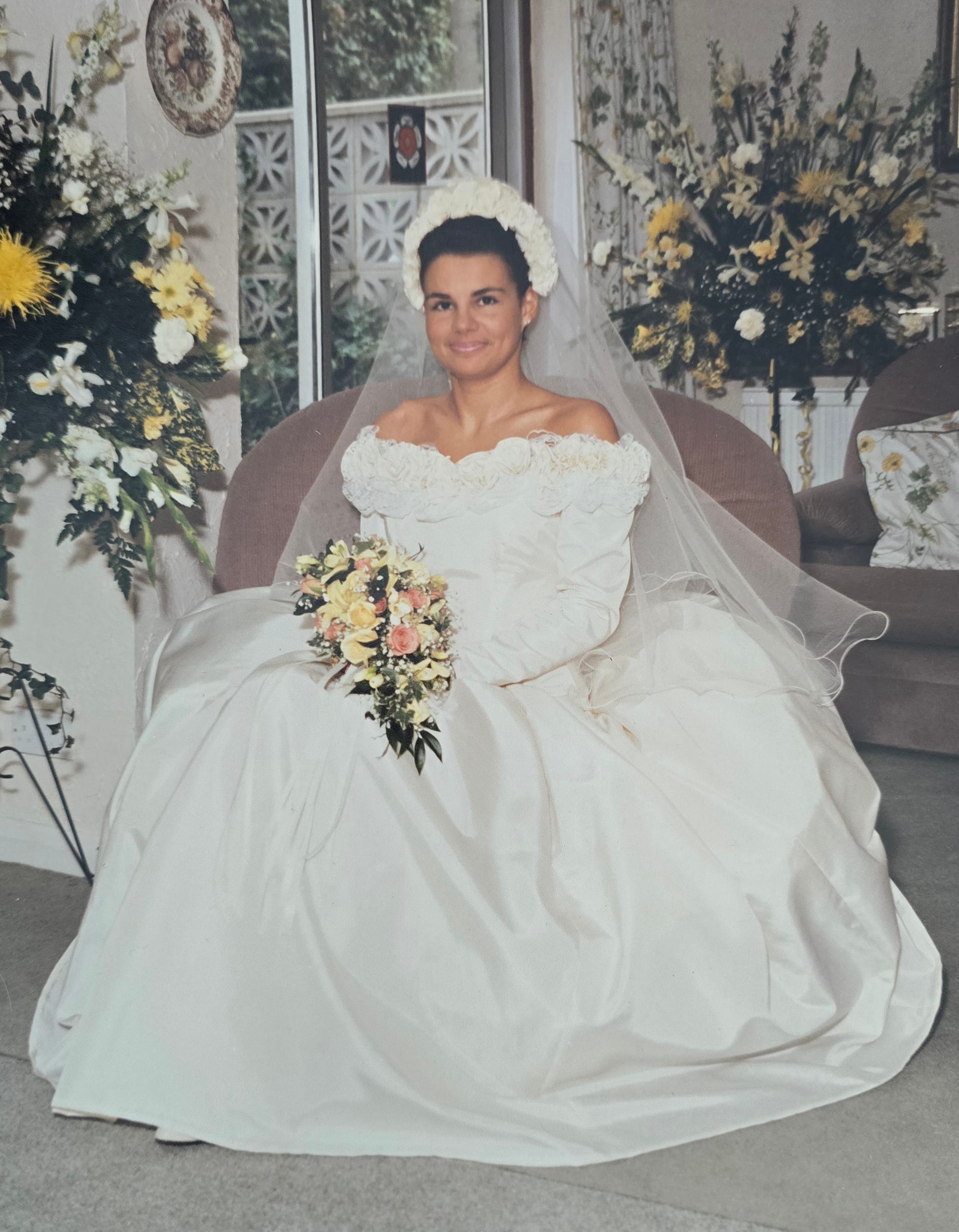 Image caption: 18th April 1992 I’m sitting in Mum and Dads lounge - with a big tent right outside the sliding patio doors, set up for our reception after the wedding ceremony at a nearby church. My design was always off-the-shoulder and I had no intention of changing that even after my cycling accident and shoulder surgery. Look carefully and you’ll see that the collar bone on my right side is sticking up. It was repaired a second time, by a surgeon who specialized in rugby injuries (as it’s a common injury in that sport) a couple of years later when the original repair failed. Amazingly my shoulder is fully functional these days and I can prove it by hammering out a couple of kilometers of front crawl in the pool multiple times a week.